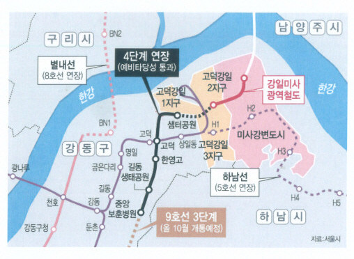 또 "지하철 9호선 연장인 4단계 노선 '보훈병원↔샘터공원'은 5월 한국개발연구원(KDI)의 예비타당성 조사를 통과했고 '샘터공원↔강일역'의 1.6Km 구간은 서울시에서 금년 8월에 사업계획을 발표할 예정이고 그 이후 예비타당성 조사를 실시할 계획이며 '강일↔미사역' 1.4Km 구간은 제3차 국가철도망 계획에 반영된 사업이다"고 말했다.