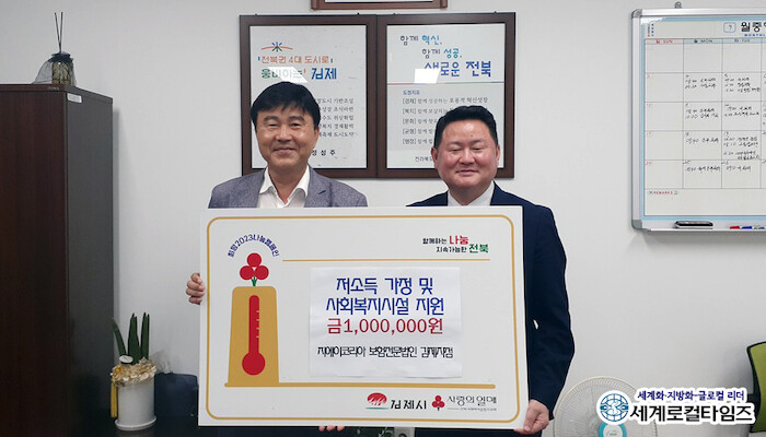 [세계로컬타임즈 조주연 기자] ㈜지에이코리아 김제지점 강동형 대표가 20일 저소득 가정을 위해 사용해 달라며 전북 김제시에 100만 원의 성금을 기탁했다.