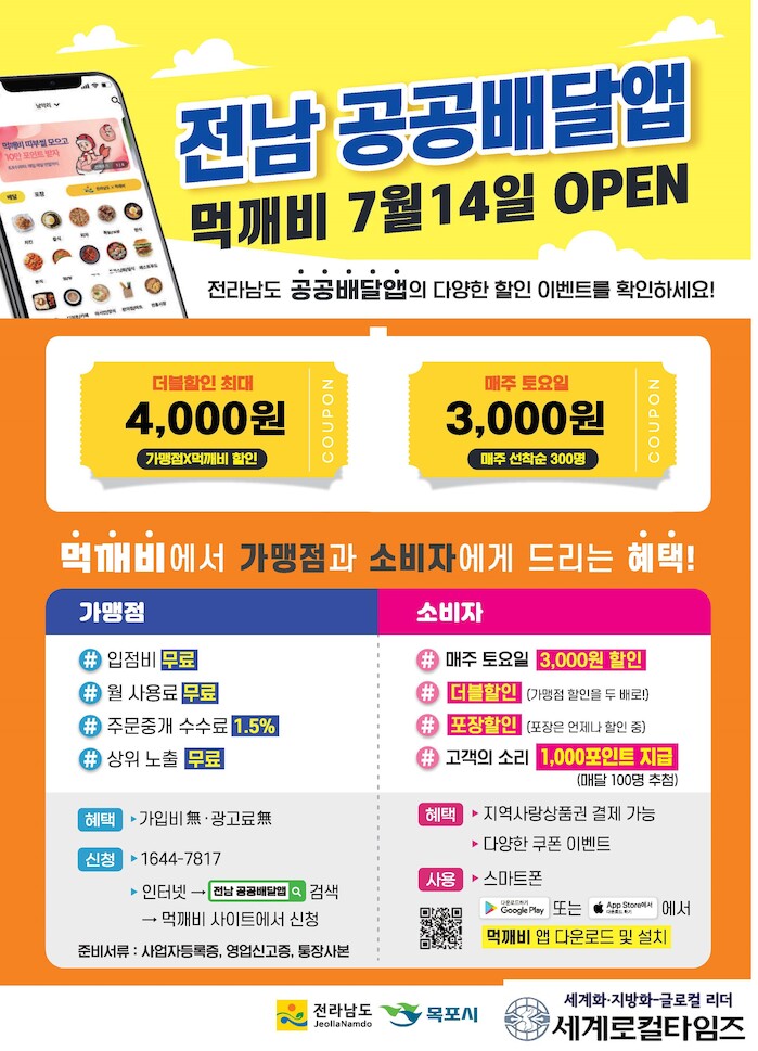 한편 먹깨비 가맹점 신청은 먹깨비 홈페이지, 업주용 ‘먹깨비 사장님’ 앱, 먹깨비 고객센터 등을 통해 가능하다. 소비자는 구글 플레이나 앱스토어에서 ‘전남 공공배달앱’이나 ‘먹깨비’를 검색해 앱을 내려받아 사용하면 된다.