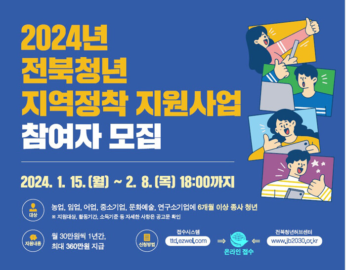 신청은 전북청년 지역정착 지원사업 누리집 또는 전북청년허브센터 누리집을 통해 온라인으로 신청하면 된다.