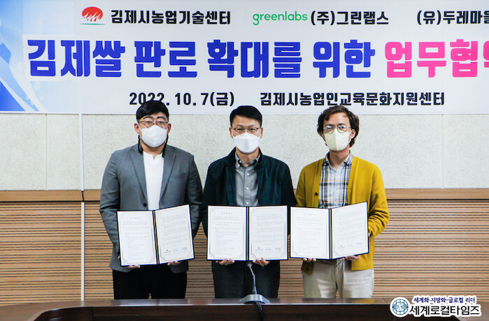 김제시는 “7일 농업회사법인 두레마을, ㈜그린랩스와 2022년 추진한 시범단지의 지속적 운영과 김제쌀 판로확대를 위한 업무협약을 체결했다”고 밝혔다.