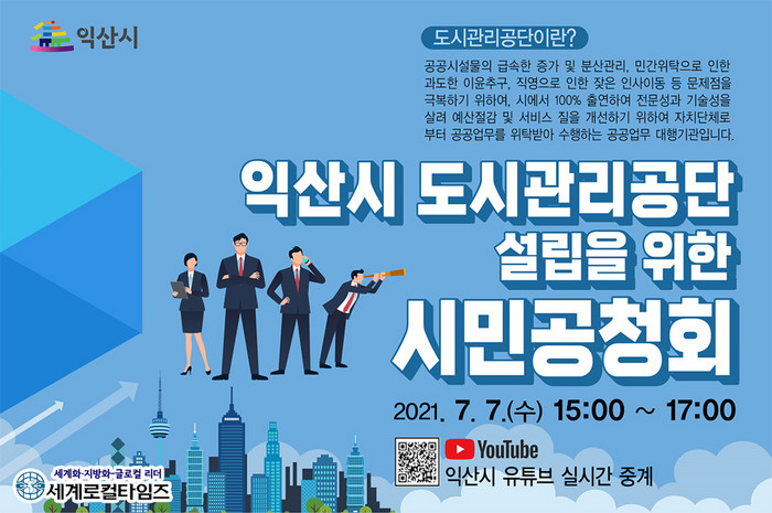 2일 익산시에 따르면 도시관리공단 설립을 위한 온·오프라인 방식의 시민공청회가 오는 7일 익산예술의전당 세미나실에서 진행될 예정이다.