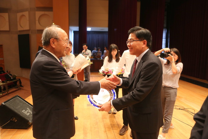 | ▲9일 대전시청 대강당에서 김민기 대전도시철도공사 사장(오른쪽)이 박진탁 사랑의장기기증운동본부 이사장으로부터 감사패를 받고 있다. <사진제공=대전도시철도공사> |