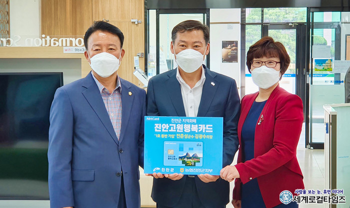 전춘성 진안군수와 김광수 진안군의회 의장은 지난 14일 NH농협은행 진안군지부를 방문해 카드형 진안고원행복카드 출시기념 1호 카드를 발급 받았다.