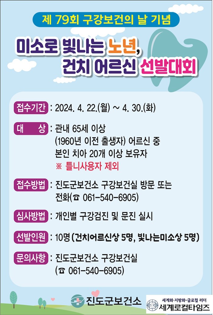 [세계로컬타임즈 문형원 기자] 진도군이 구강건강 실천의 중요성을 알리기 위해 ‘미소로 빛나는 노년, 건치 어르신 선발대회’를 개최한다.