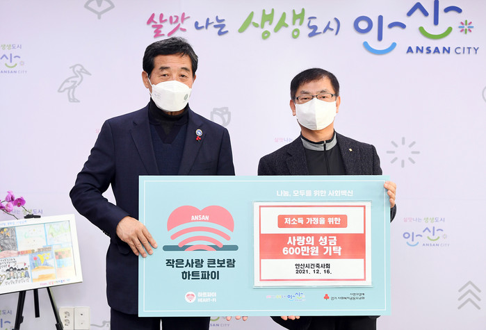 [세계로컬타임즈 김상우 기자] 안산시는 16일 안산시건축사회(회장 강동열)로부터 코로나19로 어려운 상황에 있는 저소득 소외계층을 위한 사랑의 성금 600만원을 기탁 받았다.
