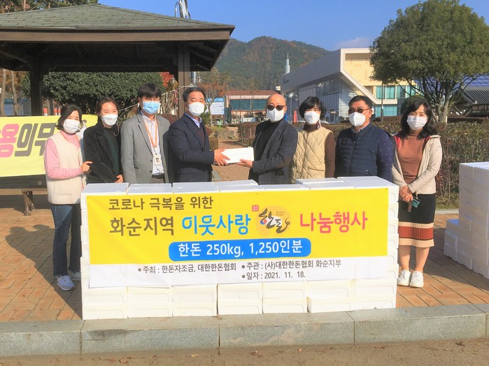 | ▲18일 대한한돈협회 화순지부에서 관내 아동·청소년 등 어려운 이웃을 위해 한돈 375박스를 후원했다. 사진은 하니움체육관에서 열린 기탁식에 참석한 서봉섭(왼쪽 4번째) 사회복지과장, 박용완(왼쪽 5번째)대한한돈협회 화순지부장 등 협회 관계자가 군청 관계자와 기념 촬영하는 모습.(사진=화순군) |