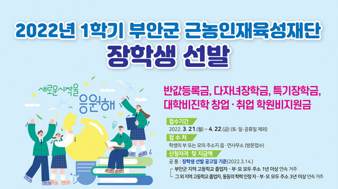 [세계로컬타임즈 조주연 기자] 전북 부안군 근농인재육성재단이 금년 1학기 장학생 선발에 들어간다.