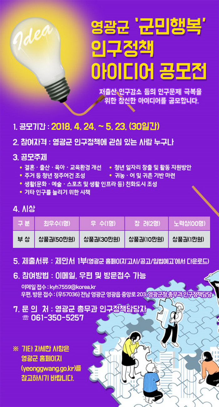 [세계로컬신문 이남규 기자] 전남 영광군이 저출산·인구감소 등의 인구문제 극복을 위한 참신한 아이디어와 생애 주기별 시책 발굴을 위해 ‘군민행복’ 인구정책 아이디어 공모전을 개최한다.