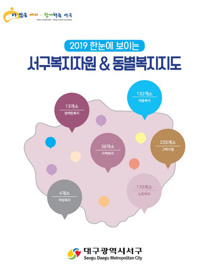 [세계로컬타임즈 류종민 기자] 대구 서구는 주민들이 지역 복지시설과 단체 등 복지자원을 알아보기 쉽게 정리한 '한눈에 보이는 서구복지자원&동별복지지도'를 제작해 활용한다.
