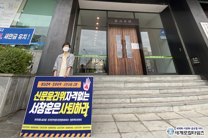[세계로컬타임즈 조주연 기자] 한국신문윤리위원회 서창훈 이사장의 퇴진을 요구하는 1인 시위가 한 달째 진행되는 가운데 언론시민단체들이 신문윤리위 이사회가 “서 이사장 퇴진을 결단해야 한다”고 촉구하고 나섰다.