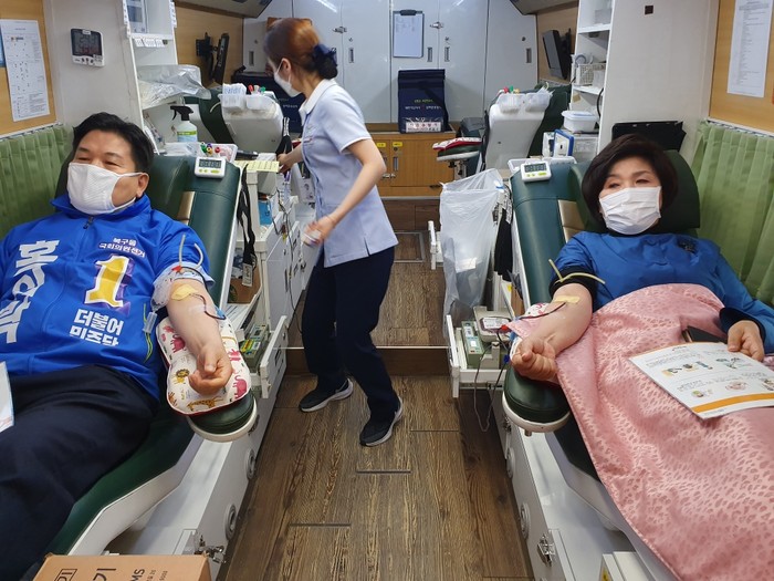 | ▲ 홍의락 의원과 김진란 여사가 함께 헌혈캠페인에 동참해 헌혈하고 있다.(사진=홍의락 의원실 제공) |
