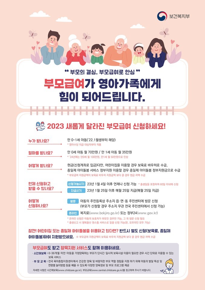 부모급여는 아동주소지 읍·면사무소로 방문 신청하거나 복지로, 정부24를 통해 신청 가능하다.