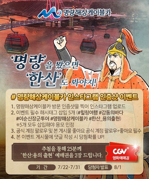 [세계로컬타임즈 강축복 기자] 영화 '한산 : 용의 출현'이 오는 27일 개봉을 앞두고 있는 가운데, 전작 영화 '명량'의 촬영지이자, 명량대첩의 현장을 운행하는 명량해상케이블카와 CGV가 손을 잡고 특별한 이벤트를 진행한다.