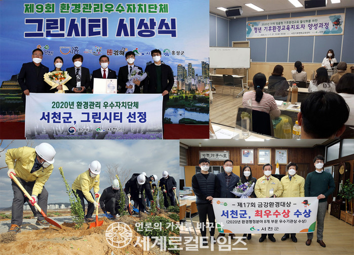 서천군에 따르면 올해 ▲환경부 공식 지정 그린시티 선정(환경부 장관 표창, 시상금 1000만 원) ▲군 단위 최초 3년 연속 공공부문 온실가스 감축 우수기관 선정(환경부 장관 표창, 시상금 2000만 원) ▲제17회 금강환경대상 최우수상(시상금 200만 원) ▲2020년 저탄소생활 경연대회 교육·홍보 부문 장려상(환경부 장관 표창)을 수상했다.