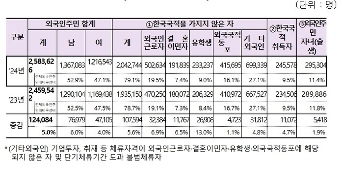 분석 결과에 따르면 2024년 11월 1일 기준, 3개월을 초과해 국내에 장기 거주한 외국인주민 수는 총 258만3,626명으로 나타났다.