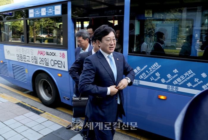 | ▲김경훈 대전시의회 의장은 세계 차 없는 날(Car Free Day)인 22일 시의회 출근을 위해 316번 버스를 탄 뒤 시청정류장에서 내리고 있다. |