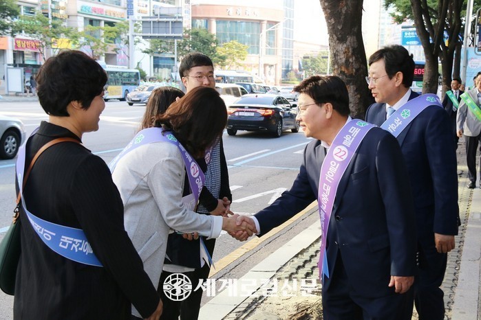 이날 김경훈 의장은 오전 8시부터 시청 네거리 일원에서 열린 ‘대중교통의 날’캠페인에 참여해 시민들에게 대중교통을 적극적으로 이용해줄 것을 당부했다.