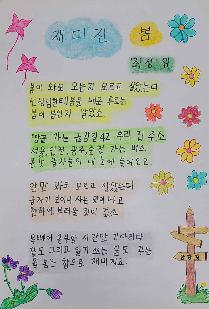 봄이와도 오는지 모르고 살았는디/ 선생님한테 봄을 배운 후로는/ 봄이 봄인지 알아소// 땅끝가는 금강길42 우리 집 주소/ 서울, 인천, 광주, 순천 가는 버스/ 온갖 글자들이 내 눈에 들어오요// 암만 봐도 모르고 살았는디/ 글자가 보이니 사는 맛이 나고/ 천하에 부러울 것이 없소// 목빼어 공부할 시간만 기다리다/ 꽃도 그리고 일기 쓰는 꿈도 꾸는/ 올 봄은 참으로 재미지요 <재미진 봄, 최성임>