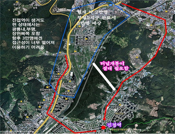 2020년 당고개–진접간 4호선 복선전철이 개통되면 진접역과 오남역 2개의 전철역이 생긴다. 문제는 진접선이 개통돼도 광능내, 부평지구, 장현 북쪽(장승)에서는 벌안산이 가로막고 있어 직선거리상으로는 금곡리 택지지구 북단인 진접역을 이용하기에는 시간이 많이 소요돼 그냥 버스를 타고 서울로 나가는 것과 별반 시간차이가 없다는 것이다.