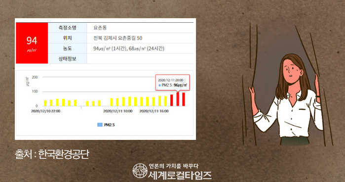 한국환경공단에 따르면 김제시의 1시간 평균 초미세먼지 농도는 96㎍/㎥이다. 정읍은 75㎍/㎥, 전주 76㎍/㎥이다.