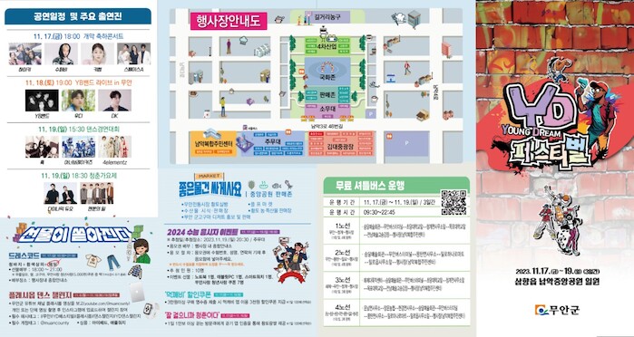 또한, 밤에는 YD페스티벌과 무안여행을 주제로 500대의 드론이 밤하늘을 수놓으며 토요일과 일요일에는 젊음의 열기를 한껏 발산할 수 있도록 DJ MIRO, QSIGN, Bagagee, MC KAHN가 함께하는 EDM공연을 마련했다.
