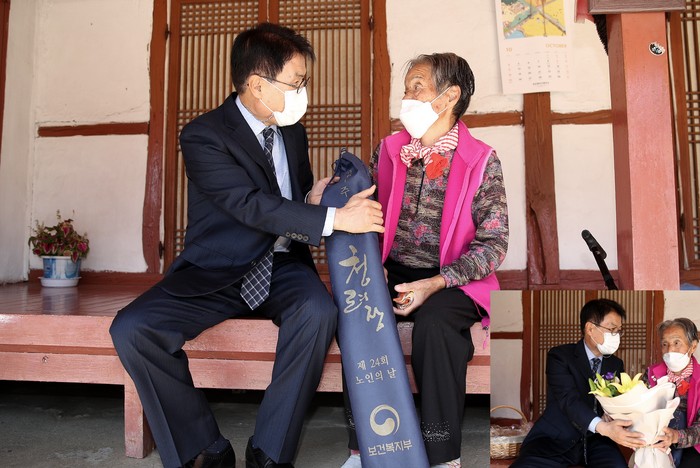 축하 꽃다발과 대통령 축하 메시지, 장수를 비는 청려장을 선물로 전달받은 어르신은 연신 고맙다는 인사를 건내셨다.