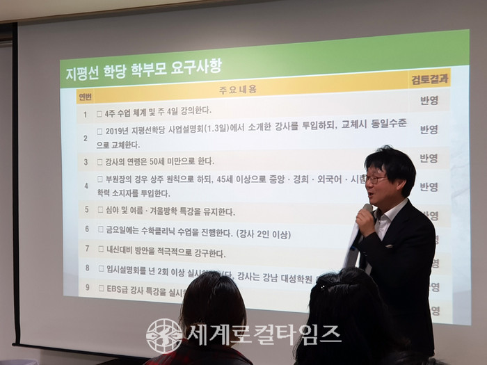 이어 "입시제도가 바뀐상태에서 차원이 다른 컨설팅이 필요하다"고 강조하는 등, 담임제, 국영수에 대한 책임 지도 강사제 외, 키움측의 지평선 학당 운영 전략 등을 학부모들에게 설명했다.