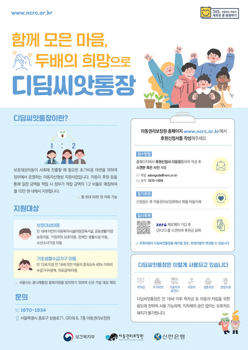 한편, 올해 디딤씨앗통장 신규가입 대상은 18세 미만의 보호대상아동(시설, 가정위탁 등)과 기초생활 수급 가구 아동(2006~2011년생)이다.