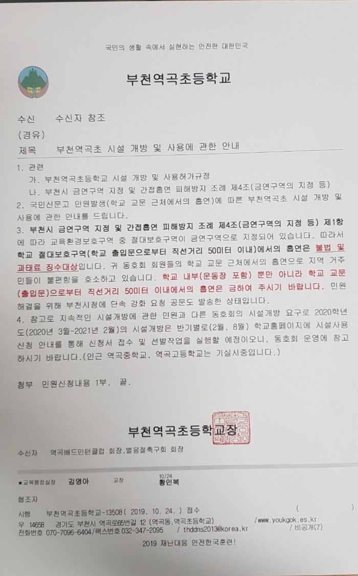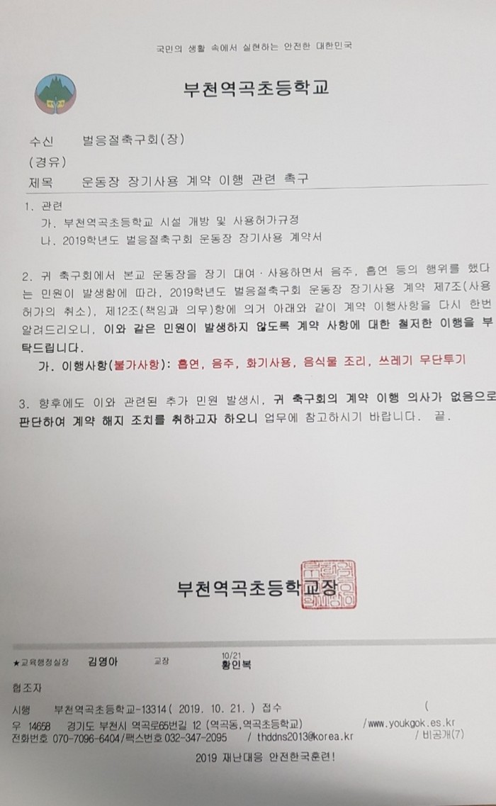 이에 따라 모든 동호회원들은 공문을 받은 후부터 교내에서 음주·흡연 행위 등을 하지 않았다. 그런데 학교장은 지난달 24일 '부천역곡초 시설개방 및 사용에 관한 안내' 제목의 공문을 축구동호회에 추가로 발송했다.