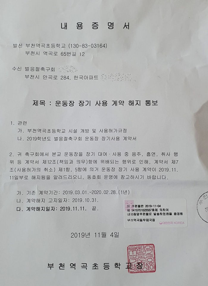 그런데도 학교장은 지난 4일 축구동호회장에게 '운동장 장기사용계약해지통보' 내용증명서를 일방적으로 보내왔다.