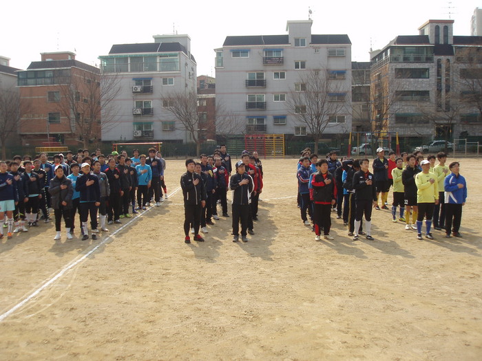 | ▲ 지난 2011년 4월 창립16회 때 인근 축구동호팀들과 시합에 앞서 국민의례를 하고 있는 모습. |