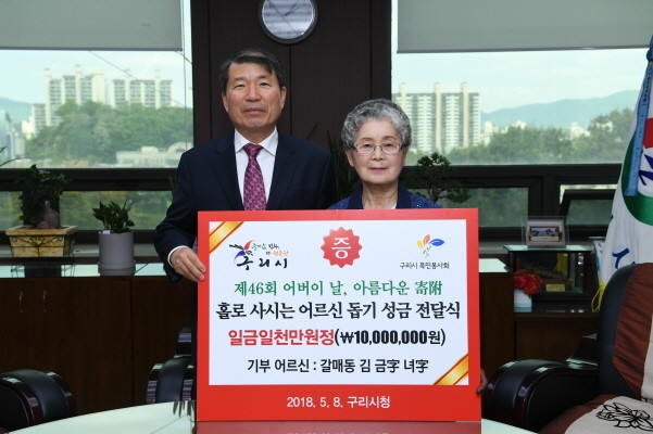 이날 김 할머니는 "가정의 달인 5월이면 더욱 쓸쓸함을 느끼는 독거 노인들을 위해 지역 사회에서 저소득 홀몸 어르신들을 위해 각종 봉사활동을 실시하고 있는 구리목민봉사회에 성금을 전달하게 됐다"라며 "큰 금액은 아니지만 외롭게 생활하는 홀몸 노인들을 위해 유용하게 사용해주길 바란다"고 말했다.