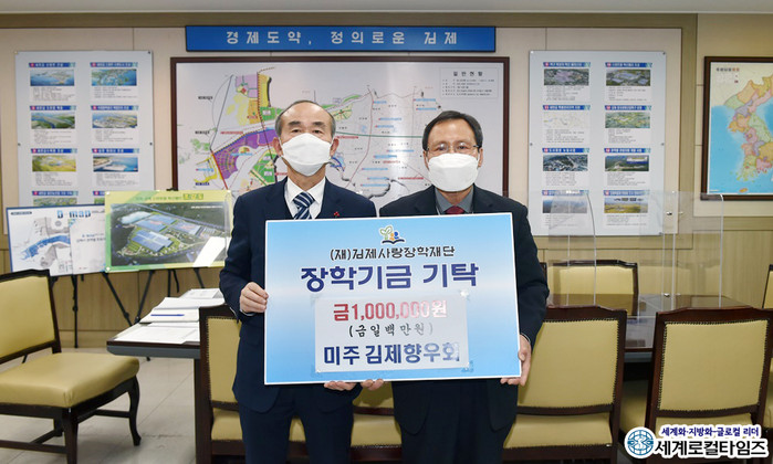 [세계로컬타임즈 조주연 기자] 미주 김제향우회가 1일 김제사랑장학재단에 장학기금 백만원을 기탁했다.