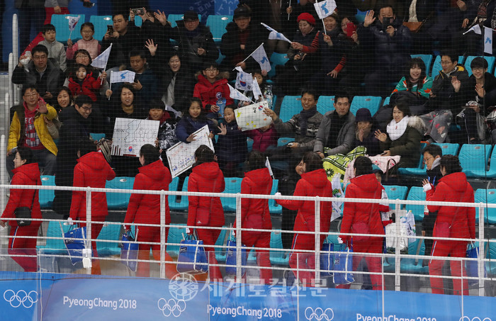 세계로컬타임즈 - "반가워요" 북한 응원단 환하게 맞이하는 관중들