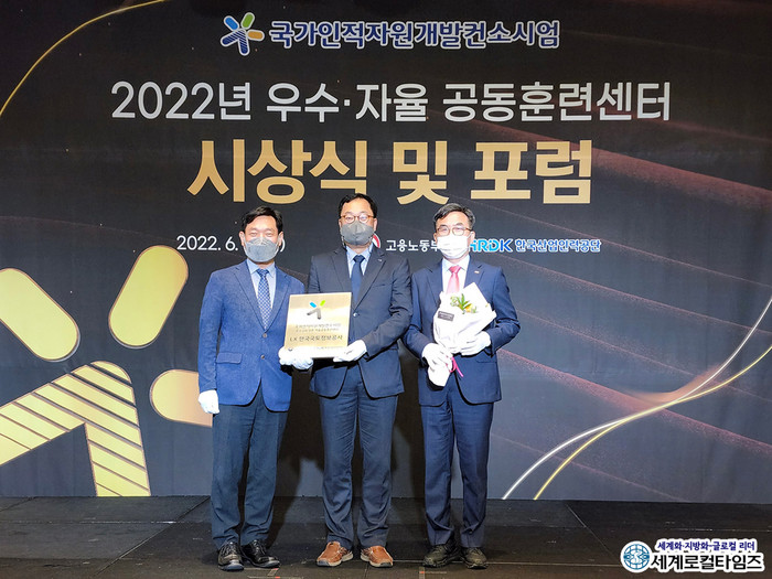 | ▲지난 17일 2022년 국가인적자원개발컨소시엄 사업 최우수 기관 시상식에서 공간정보아카데미 최광제 실장이 자율공동훈련센터 현판을 수여 받았다. 왼쪽은 고용노동부 유경희 국장, 오른쪽은 한국산업인력동단 강현철 이사. ⓒ한국국토정보공사 |