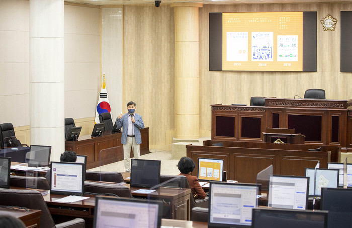 8일 안산시의회에 따르면 전날 의회 본회의장에서 진행된 교육에는 박은경 의장과 윤석진 부의장을 비롯한 의원들과 의회사무국 간부 직원들이 참여했으며, 나머지 사무국 직원들은 코로나19 방역 지침에 따라 사무실에서 중계방송을 통해 교육을 청취했다.