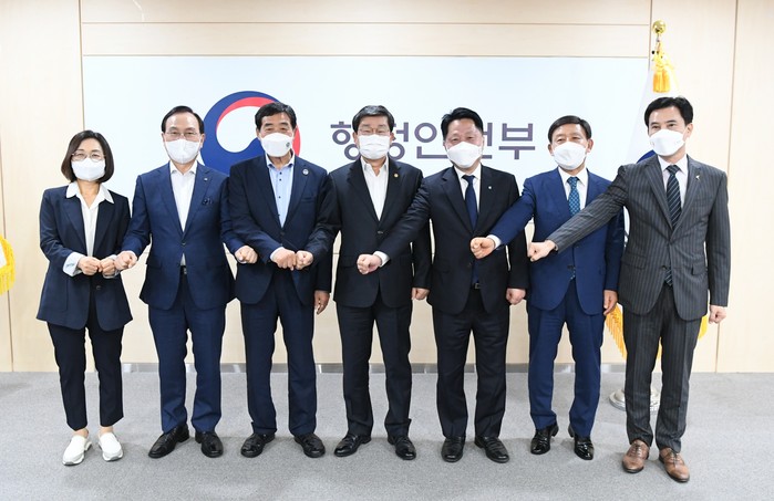 | ▲ 사진 왼쪽으로부터 은수미 성남시장, 박상돈 천안시장, 윤화섭 안산시장, 전해철 행정안전부장관, 장덕천 부천시장, 허성곤 김해시장, 서철모 화성시장.(사진=안산시) |