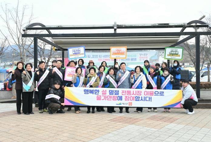 전통시장 오일장 일정에 맞춰 덕산·예산·삽교·예산역전시장 순회물가안정 캠페인 모습[세계로컬타임즈] 예산군은 설 명절을 맞아 관내 전통시장 정기 오일장 일정에 맞춰 담당부서 직원과 소비자교육중앙회 예산군지회 회원 등이 참여한 가운데 전통시장 장보기와 물가안정 캠페인을 펼쳤다.