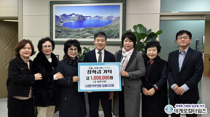 [세계로컬타임즈 조주연 기자] 한국부인회 김제시지회가 7일, 김제사랑장학재단에 장학금 100만 원을 기탁했다.