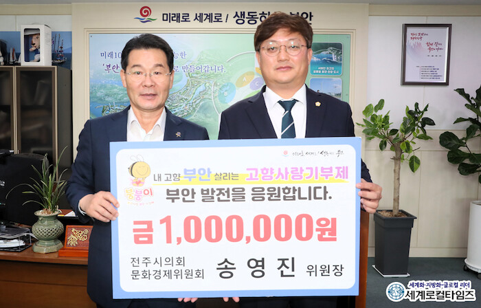 [세계로컬타임즈 조주연 기자] 전북 전주시의회 송영진 의원이 부안군에 고향사랑기부금 100만 원을 전했다.