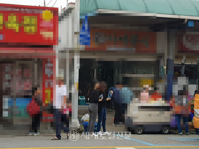 | ▲ 지난해 9월 27일 오후 전북 김제시가 시 공무원들을 대상으로 추석명절 전 전통시장 장보기 행사를 진행한 가운데 행사시작 21분만에 공무원으로 추정되는 한 여성이 빈 손으로, 또다른 여성은 김제시가 장보기 행사에 지급한 시장 주머니를 손에 들고 김제전통시장에서 한참 떨어진 곳에서 누군가를 기다리고 있다. |