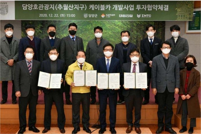 전남 담양군은 22일 삼안·대림건설·이엠티씨 등 3개 기업과 담양호관광지 추월산지구 케이블카 개발 사업을 위한 투자협정을 체결했다.