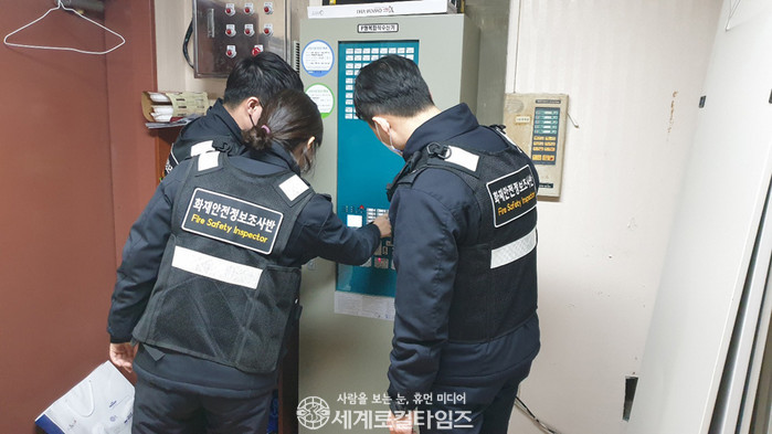 | ▲완주소방서 특별점검반이 자동화재탐지설비 수신반 정상 작동유무를 점검하고 있다.(사진=완주소방서 제공) |
