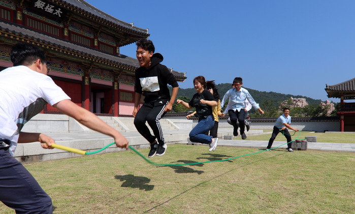 | ▲ 김해가야테마파크에서 2017 가을축제인 '가을추억만들기'가 진행되고 있는 가운데 시민들이 단체줄넘기 프로그램에 참여하고 있다.<사진제공=김해가야테마파크> |