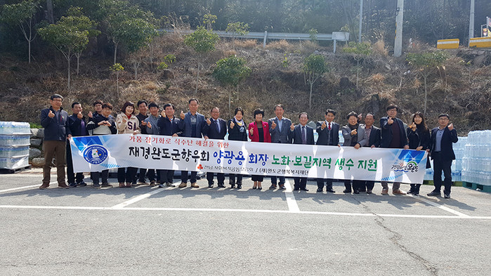 | ▲ 재경완도군향우회 양광용 회장이 가뭄으로 식수난을 겪고 있는 노화읍과 보길면에 2리터 생수 2만명을 지원하고 기념촬영을 하고 있다. <사진제공=완도군청> |