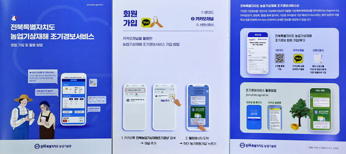 3일 전북농기원에 따르면 안내서 제작은 지난해 하반기부터 농업기상재해 조기경보서비스 회원 가입을 위해 카카오채널, QR코드 등 온라인 방식이 도입됨에 따라 이를 홍보하기 위해 추진됐다.