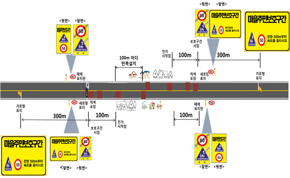 기본인지·단속형 개선은 마을 시작 지점 전방 100m부터 끝나는 지점 후방 100m까지를 ‘보호구간’으로 설정하고, 안내표지, 교통안전표지, 노면표시, 미끄럼방지포장, 과속단속카메라 등 교통안전시설을 설치하는 것이 골자다.
