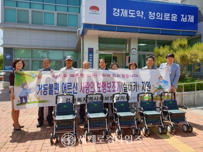 [세계로컬타임즈 조주연 기자] 전북 김제시 검산동지역사회보장협의체가 지난 10일, 관내 거동이 불편한 저소득 어르신들께 25대의 보행보조기, 일명 실버카를 지원했다.