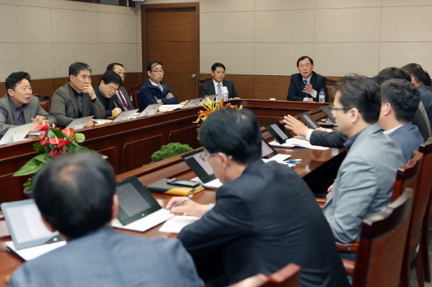 | ▲김성기 가평군수(중앙)가 지난 19일 부군수와 실과장 등이 참석한 가운데 인구늘리기 사업에 대해 토론을 벌이고 있다.<사진제공=가평군청> |